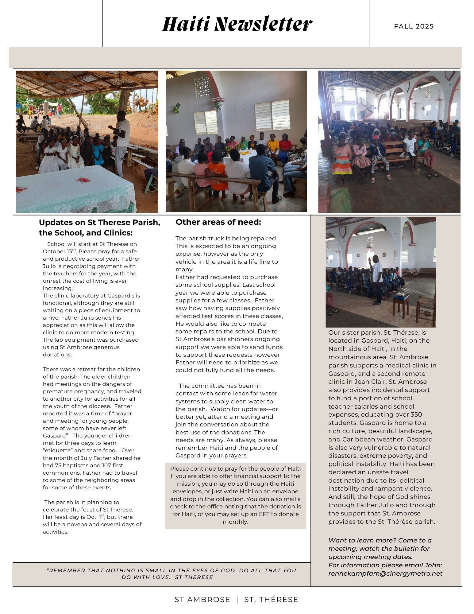 Please continue to generously support our sister parish through the envelopes that you should be receiving with the regular parish envelopes (please mail into St. Ambrose or drop in the collection basket or simply mark an envelope with “Haiti Mission” if you are not receiving the envelopes). Please keep the priest, parishioners of St. Therese, and Haiti in general in your prayers.