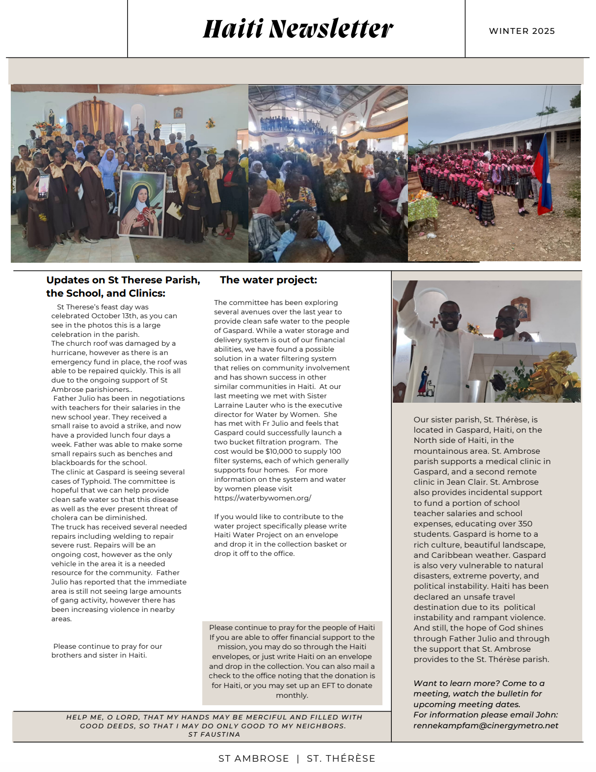 Please continue to generously support our sister parish through the envelopes that you should be receiving with the regular parish envelopes (please mail into St. Ambrose or drop in the collection basket or simply mark an envelope with “Haiti Mission” if you are not receiving the envelopes). Please keep the priest, parishioners of St. Therese, and Haiti in general in your prayers.